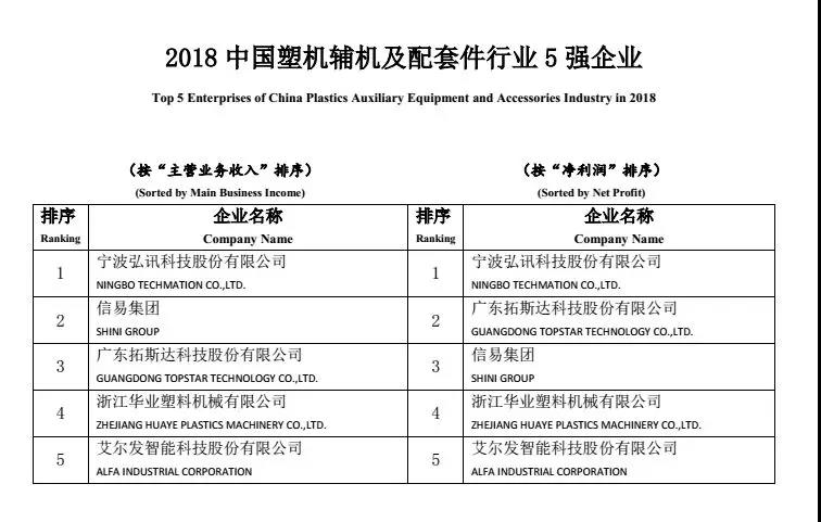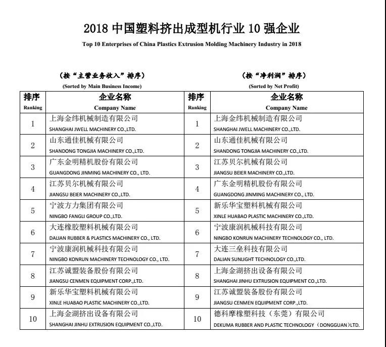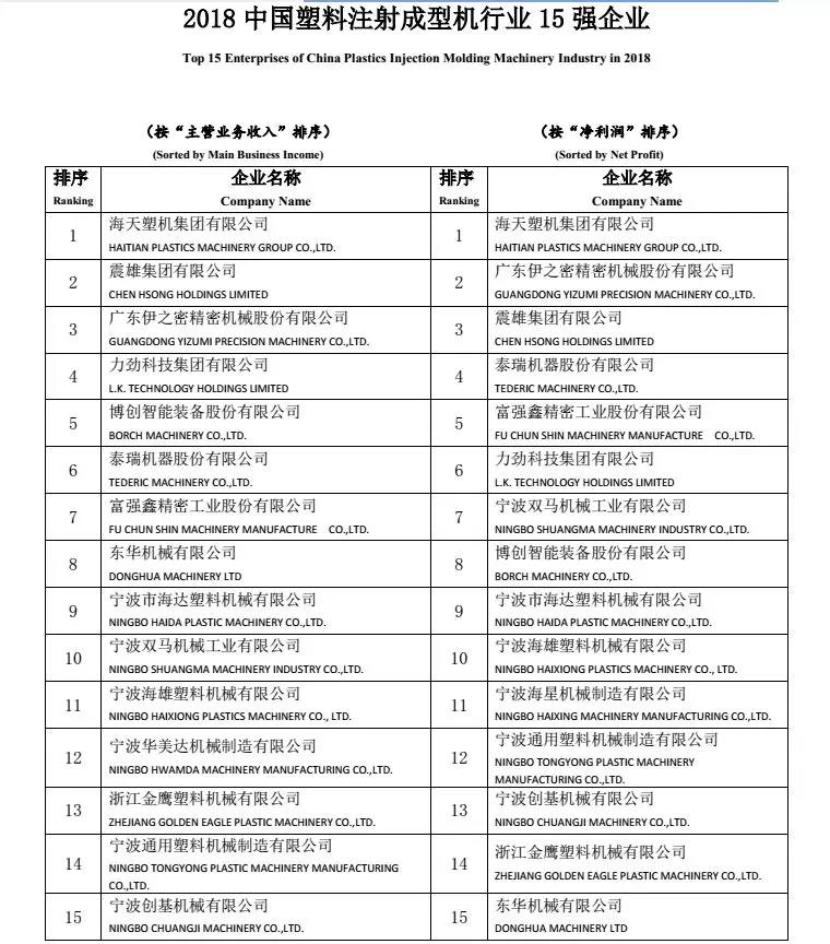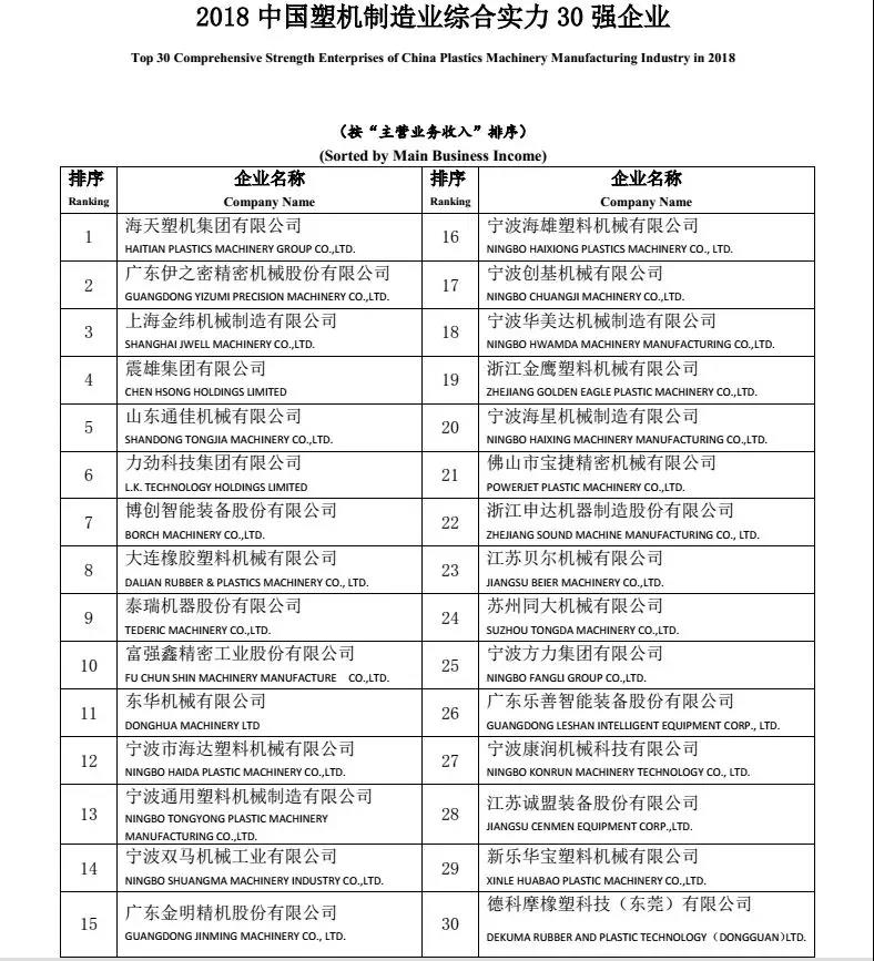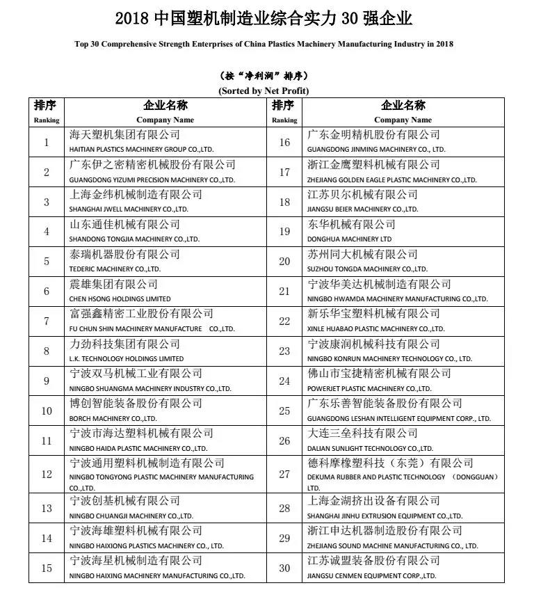 中国塑料机械工业协会以“主营业务收入”和“净利润”为主要指标,根据各单位上报的2017年度资料,经相关部门审计、核实和公示,并对公示阶段提出的问题进行核对和解答后,确定评出“2018中国塑机制造业综合实力30强企业”、“2018中国塑料注射成型机行业15强企业”、“2018中国塑料挤出成型机行业10强企业”、“2018中国塑料中空成型机行业3强企业”和“2018中国塑机辅机及配套件行业5强企业”名单。