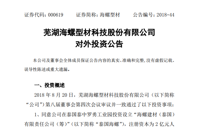 8月21日,海螺型材(000619.SZ)发布对外投资的公告,显示其将在泰国泰中罗勇工业园投资设立泰国海螺,同时,以泰国海螺为主体,建设年产能2万吨铝型材项目,并配套投资年加工能力5万平米塑料门窗和5万平米铝合金门窗生产线以及3MW光伏屋面项目,固定资产总投资约2.87亿元,配套流动资金约1.13亿元。