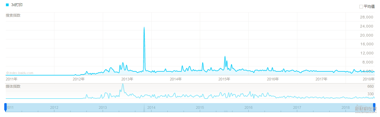 新材料在线®通过百度指数了解,“3D打印”关键词搜索指数从2012年开始呈现明显上升趋势,其中2013年11月上旬,搜索指数周平均指数超过20 000, 远高于平常。据新材料在线®了解,当周发布的一条重磅新闻是“全球首支3D打印金属枪问世”。