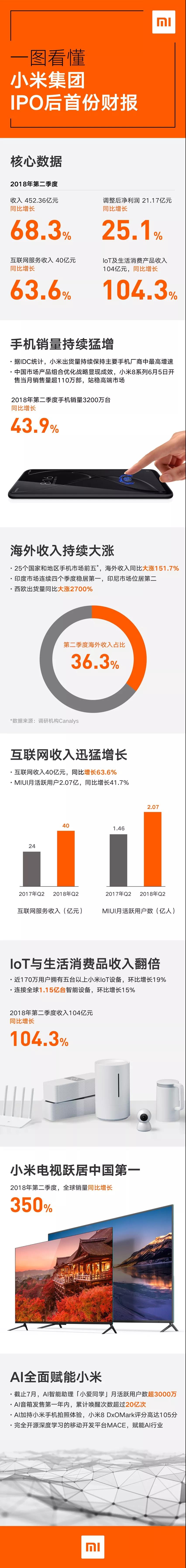 今天,小米集团发布了截至2018年6月30日的第二季度财报。财报显示,2018年第二季度小米集团收入452.36亿元,同比增长68.3%;手机销量3200万台,同比增长43.9%;互联网服务收入同比增长63.6%;loT及生活消费产品收入翻倍,小米电视全球销量同比猛增350%,跃居中国第一。