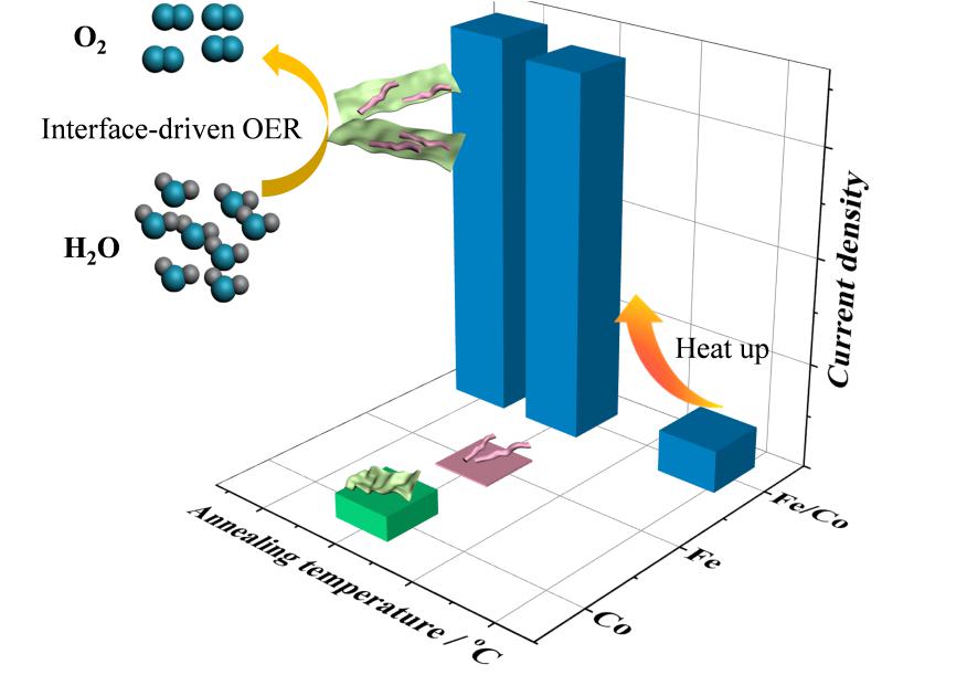 中国科学院福建物质结构研究所王要兵课题组及其合作者吴克琛组副研究员李巧红 近期通过过渡金属异质结构界面调控,促进了对水及有机小分子电催化氧化过程。在该研究工作中,研究人员首先分别制备了金属 Co(O) 纳米片和金属 Fe(O) 纳米链,再将两种纳米结构进行热耦合组装,形成具有明确界面结构的纳米异质结。球差透射电子显微镜以及粉末衍射结果证实:热耦合过程中,无定形 Co(O) 纳米片在 Fe(O) 的诱导下,于界面边缘处产生大量局域微晶结构,这些微晶结构为电催化反应提供了丰富的阶梯、扭结和不饱和活性位点;此外,光电子能谱分析发现:该热耦合纳米异质结构材料在界面处形成部分 Co-O-Fe 桥联物种;同时,界面重排产生了大量氧缺陷位点,该过程未见报道。上述三个因素协同作用,极大地促进该 Fe/Co 异质结构材料的电催化活性。电催化测试结果表明:电流密度在 50 mA cm - 2 时其析氧过电位只有 329 mV ,且保持连续 20 h 电解不衰减。密度泛函理论计算揭示该异质结构材料中,邻近界面的 Fe 活性位点可极大地促进羟基自由基向吸附态氧转化,从而提高析氧活性。当采用苯甲醇作为配对氧化反应,该异质结构材料与商业 Pt 片作为两电极时,在 10mA cm - 2 条件下电解水的电压可降至 1.42 V ,因而具有极高的商业应用价值。