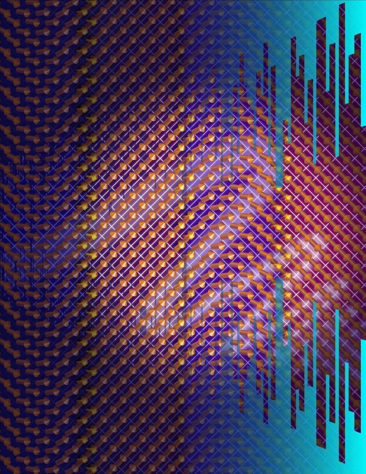 图为艺术家的畴壁变体材料的渲染俯视图,其特征是在铁电晶体薄膜中分离对准偶极子区域的漫射边界。这些二维缺陷可调谐共振波动使微波射频介质损耗降低到超出晶体的固有极限。图片来源:德雷塞尔大学