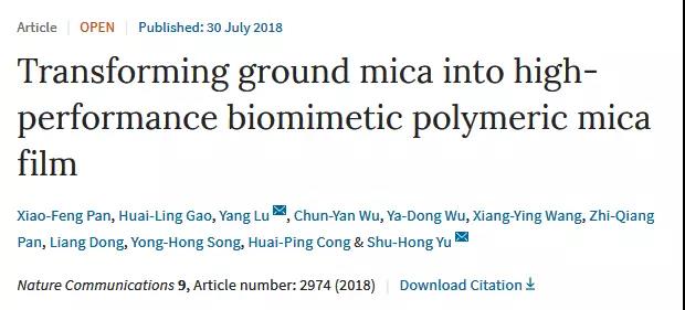 近日,合肥工业大学化学与化工学院陆杨教授研究组和中国科学技术大学俞书宏教授研究团队合作,创新性地采用“解组装-仿生组装”的两步策略,以廉价天然云母粉为原料,成功实现了高质量云母纳米片的大量制备,并组装成高性能透明柔性仿贝壳结构云母复合膜。这一高性能仿生复合薄膜在柔性透明电子器件等领域具有广阔的应用前景。相关成果发表在7月30日出版的英国《自然-通讯》上。合肥工业大学2014级博士生潘晓锋和中国科大博士后高怀岭为共同第一作者。