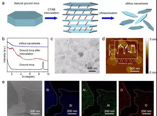 图1 云母纳米片的制备及表征。(a) 云母纳米片制备策略;(b) 云母粉、插层云母和云母纳米片的小角度XRD;(c) 云母纳米片的TEM图像;(d) 云母纳米片的AFM图像;(e) 云母纳米片的TEM-mapping图像。