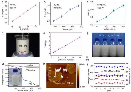 图2 云母纳米片的放大制备。(a-c) 云母纳米片分散液的浓度与起始的浓度、超声功率和体积的关系;(d) 云母纳米片的宏量制备过程;(e) 云母纳米片的产量与剥离次数的关系;(f) 云母纳米片的分散液;(g-i) 聚酰亚胺修饰的云母纳米片的热重、厚度和稳定性。