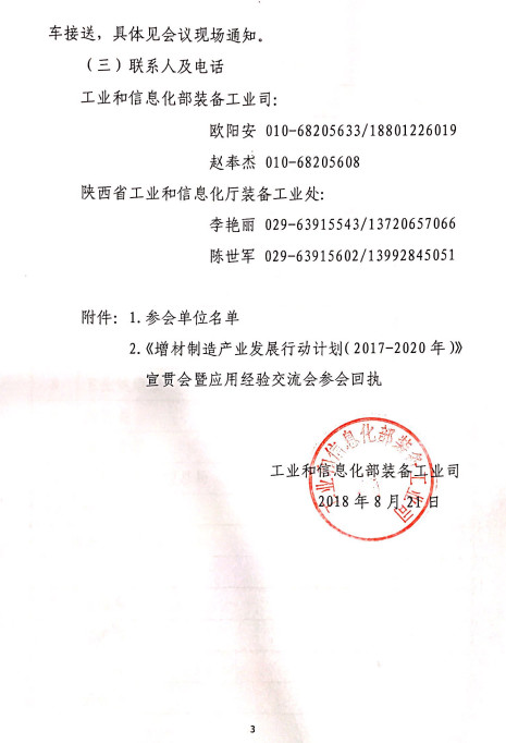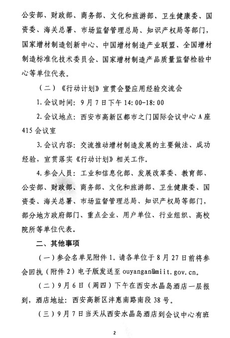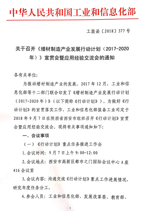 动增材制造产业的发展,2017年12月,工业和信息化部等十二部门联合印发了《增材制造产业发展行动计划(2017-2020年)》(以下简称《行动计划》)。为做好《行动计划》的宣贯落实工作,在中国增材制造产业联盟支撑下,工业和信息化部装备工业司定于2018年9月7日在陕西省西安市组织召开《行动计划》宣贯会暨应用经验交流会(会议仅限内部邀请单位参加,不收取任何费用)。现将有关事项通知如下: