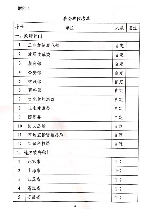 4.参会人员:工业和信息化部、发展改革委、教育部、公安部、财政部、商务部、文化和旅游部、卫生健康委、国资委、海关总署、市场监督管理总局、知识产权局等部门,部分地方政府部门、重点企业、用户单位、行业组织、高校院所等单位代表。