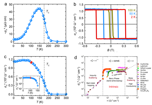 图四:实验测量的反常霍尔效应及其与温度和纵向电导的依赖关系