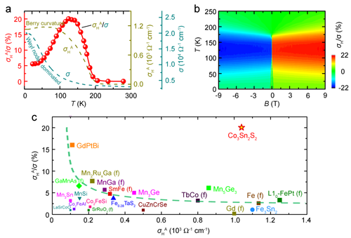 随后,刘恩克采用自助溶剂等方法生长了高质量单晶样品。在150 K的宽温区内观察到了大反常霍尔电导(~1130Ω -1 cm -1 )和巨反常霍尔角(~20%),均比常规磁性材料高出一个数量级。电输运测量表明,Co 3 Sn 2 S 2 具有非饱和的正磁电阻和低的载流子浓度,表现出补偿型半金属特征。同时,反常霍尔电导对温度和纵向电导均无依赖关系,使得该体系在反常霍尔效应的统一模型中居于内禀的“贝利相位”区,表明该体系中的反常霍尔效应来源于动量空间的贝利曲率。在较宽的温区内稳定存在的贝利曲率与低载流子浓度半金属特性使得Co 3 Sn 2 S 2 获得了巨大的反常霍尔角。