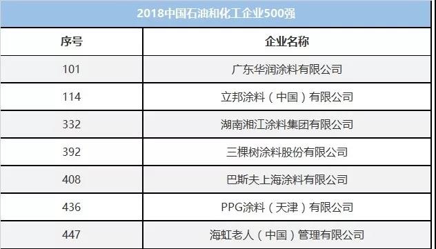 榜单显示,涂料企业有7家上榜,分别是:广东华润涂料有限公司、立邦涂料(中国)有限公司、湖南湘江涂料集团有限公司、三棵树涂料股份有限公司、巴斯夫上海涂料有限公司、PPG涂料(天津)有限公司、海虹老人(中国)管理有限公司纷纷入选,分别位居第101、114、332、392、408、436、447位。