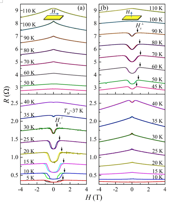 图1. Sr4Ru3O10纳米薄片(d=260nm)在不同温度下的磁阻。(a) H//ab; (b) H//c。