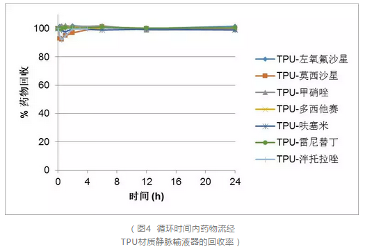 从实验的整个输注循环过程的药物含量上看,TPU材质静脉输液器表现出类似或优于TPE-S和PVC的性能,对于不同性质的药物的吸着作用非常低。对于泮托拉唑钠,TPU材质静脉输液器的性能优于TPE-S和PVC,且吸附作用小于TPE-S和PVC。TPU的特性及其与药物的相容性使其非常适合用于血管内输液器。