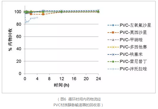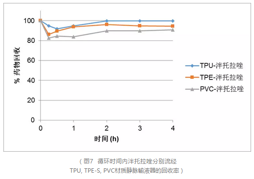 七种药物的性质虽各不相同,TPU材质静脉输液器都表现出很好的药物回收率。在建议的临床应用参数下,药物吸着几乎不见,均达到95%以上的药物回收。在超过临床滴注时间的长期循环时间内(达到4 – 24小时)也没有发生药物吸着。在注射用泮托拉唑钠的研究中发现,TPE-S材质静脉输液器产品在接触到药液的初期存在吸着情况,药液回收低至近85%,在整个循环时间内与初始药液浓度比在86.08%-94.52%;PVC材质静脉输液器产品在整个药液输注过程中均存在吸着情况,与初始药液浓度比在82.58%-90.71%间;而TPU材质静脉输液器对于该药液有良好的药物相容性。从药物回收浓度曲线图上可看出,药物浓度在PVC材质静脉输液器中的回复较缓慢,其吸着行为偏向于吸收;在TPE-S材质静脉输液器中的上升较快,其吸着行为偏向于吸附。请见图4– 图7。