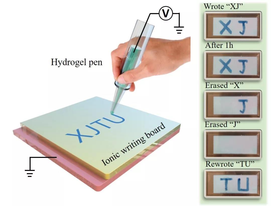 此外,论文中首次展示了一种基于电致变色原理的可擦写离子书写板(如图2所示)。该设计突破了电致变色显示器件不可擦写的局限,驱动电压低至~1 V。这项工作对下一代电致变色器件的设计与研发具有重要的意义,同时也为离子水凝胶的应用提供了一种全新的思路。