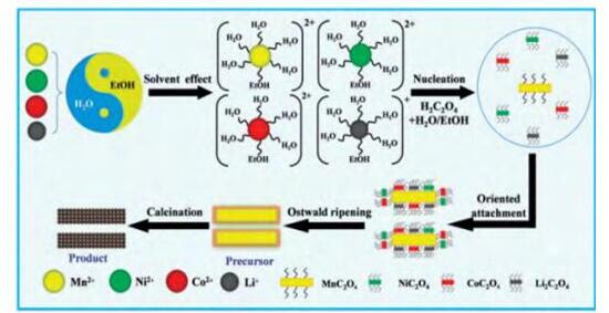 Ma等采用一步法草酸共沉淀制备锰基三元材料的过程中发现,通过在纯水体系中混入乙醇,可以改变溶液的电介质常数,从而改变溶质、溶剂间的相互作用力,降低晶体成核阻碍,加快Ni 2+ 、Co 2+ 和Mn 2+ 与草酸沉淀反应的进行。