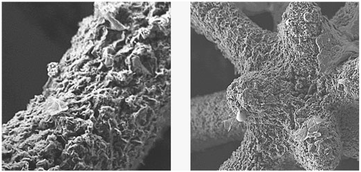 左:以1微米的分辨率放大石墨烯八位体桁架的扫描电子显微镜照片。右:以10微米的分辨率放大石墨烯八位体桁架的扫描电子显微镜照片。(图片来源:弗吉尼亚理工大学)
