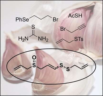 新鲜大蒜提取物含有多种健康的有机硫化合物,其中ajoene(阿焦烯,从大蒜中提出的血小板凝集抑制剂)是一种主要的可榨油成分。如今,英国的化学家们首次使用现成的成分合成了ajoene,研究结果发表在Angewandte Chemie上。文章表明,ajoene可以大规模制得,且只需很少的合成步骤。生物活性化合物的化学合成对于它们在药物研究中的进一步评估具有重要意义。
