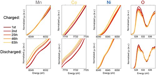 图2 Li 1.2 Ni 0.15 Co 0.1 Mn 0.55 O 2 中不同元素在不同充放电周次的X射线吸收光谱。