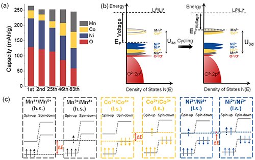 图3 Li 1.2 Ni 0.15 Co 0.1 Mn 0.55 O 2 不同充放电周次的氧化还原反应(a)不同元素在不同充放电周次对容量的贡献;(b)电子结构变化带来的锂离子储存电势的变化;(c)不同过渡金属氧化还原电对能级差异与电压衰减关联。