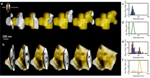 图4 (a)和(b)电极颗粒在电化学循环前后的三维形貌图;(c)和(d)循环前材料颗粒中内部微孔孔径分布统计;(e)和(f)循环后材料颗粒中内部微孔孔径分布统计。