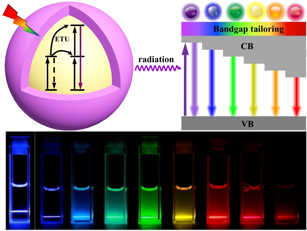基于稀土纳米晶和全无机钙钛矿量子点的辐射能量传递上转换发光调控示意图