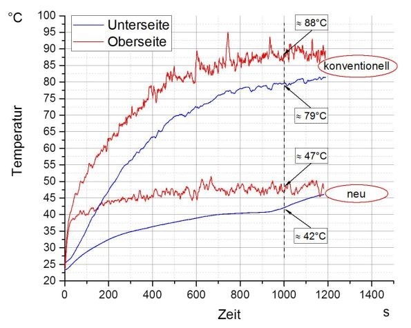 实验比较了Fraunhofer LBF研究出的新型复合相变材料与传统仪表板用的聚丙烯-滑石粉复合材料。在暴露于1200瓦/平方米辐射功率的环境下1000秒,样品表面上的温度差大约为41°C,这也就相当于温度降低了46%。