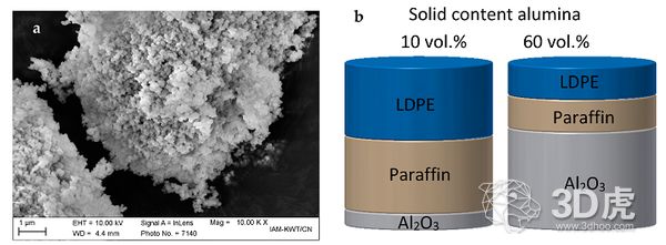 据研究报告称,氧化铝固体含量在50%(体积)左右的材料能表现出良好的3D打印性能,而含有55%(体积)固体含量的材料则需要以400μm的喷嘴尺寸进行打印才能有良好的3D打印性能。填充量达60 vol%的材料因为粘度太高必须手动挤出。