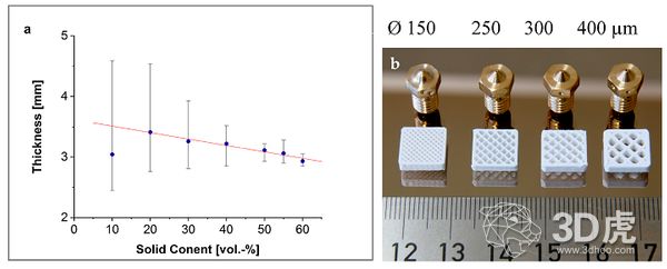 (a)材料直径随固体含量的变化 (b)用不同喷嘴尺寸打印的开放式测试结构