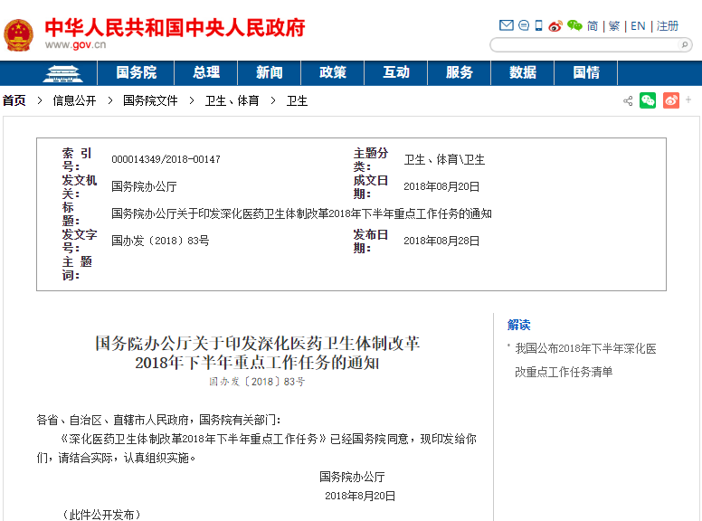 8月28日,国务院办公厅正式发布《深化医药卫生体制改革2018年下半年重点工作任务》,要求有序推进分级诊疗制度建设,规范医疗联合体建设和发展,着重通过规范诊疗行为为降低药品、医用耗材等费用腾出空间,优化调整医疗服务价格,重点优化调整体现医务人员技术劳务价值的价格,降低大型医用设备检查治疗和检验等价格。