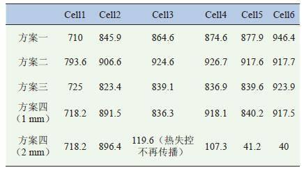 对4 种方案下正常工况与热失控时电池组的散热与隔热性能进行分析,对比验证该集成系统的热管理性能,并探究了隔热板厚度对于热失控传播的阻隔作用结论如下: