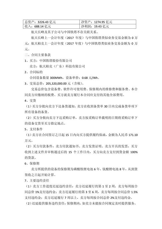 8月29日晚间, 航天长峰发布公告称,近日公司控股子公司航天柏克(广东)科技有限公司(以下简称“航天柏克”或卖方)与中国铁塔股份有限公司(以下简称“中国铁塔”或买方)签署《中国铁塔股份有限公司梯级锂电池设备及相关服务采购合同》,买方(中国铁塔)同意向卖方购买、卖方(航天柏克)同意向买方出售梯级锂电池设备和服务。合同设备采购数量300MWh,总价为 20532 万元(含税)。