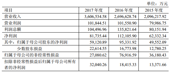 据中铝国际招股说明书披露,公司2015年、2016年、2017年分别实现营业收入209.62亿元、269.66亿元、360.65亿元;实现归属于母公司股东的净利润4.96亿元、9.53亿元、5.91亿元。具体如下: