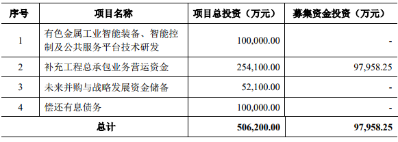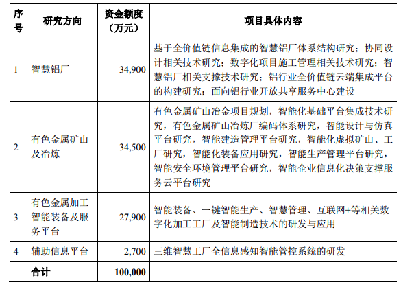 中铝国际表示,以上项目所需募集资金投入合计为97,958.25万元。其中,有色金属工业智能装备、智能控制及公共服务平台技术研发项目将结合中国有色金属工业的实际与中铝国际的特点和优势,制订中国有色金属工业4.0版的发展路线图,按照专业领域和中铝国际的主营业务分工,分为四个研究方向:智慧铝厂、有色金属矿山及冶炼、有色金属加工智能装备及服务平台以及辅助信息平台。具体研究方向如下: