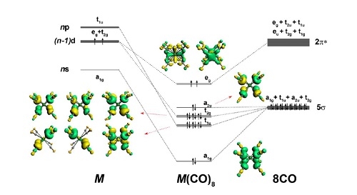 归功于“一来一往”的σ-π配键,过渡金属能够与CO配体形成稳定的羰基配合物。具体而言,CO将孤对电子给予对称性匹配的中心金属原子的空轨道,形成σ给予键;中心金属原子d轨道电子则反馈进入CO的空的反键π轨道,形成π反馈键,两相协同,使配合物得以稳定存在。由于具有σ对称性的s轨道拥有电子,而d轨道为空,碱土金属元素几乎正好与形成稳定σ-π配键的期望条件背道而驰,因此一般认为碱土金属元素无法像过渡金属一样与CO配体形成稳定的羰基配位化合物。