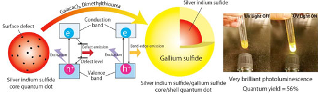 图为银铟硫化物/硫化镓核壳量子点的结构和在室内光照下的核/壳量子点图片。(图片来源:大阪大学)
