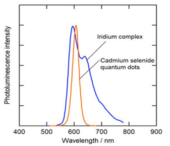图为铱络合物和常规硒化镉量子点的光致发光光谱。(图片来源:大阪大学)