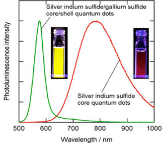 图为银铟硫化物核心量子点和涂有硫化镓壳层的发光光谱。(图片来源:大阪大学)