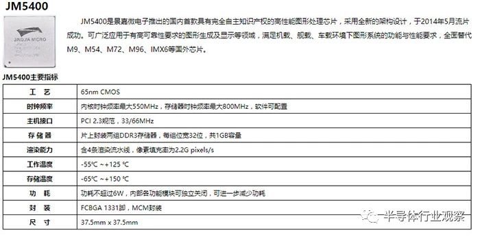 景嘉微公司是一家军民融合公司,旗下的产品涉及GPU芯片、军用雷达等等,其中景美系列GPU芯片目前是他们的核心业务,营收、盈利占比超过70%,2014年该公司研发成功了JM5400 GPU芯片,号称是国内首款具有自主知识产权的高性能GPU芯片,可广泛应用于有高可靠性要求的图形生成及显示等领域,满足机载、舰载、车载环境下图形系统的功能与性能要求,全面替代M9、M54、M72、M96、IMX6等国外芯片。