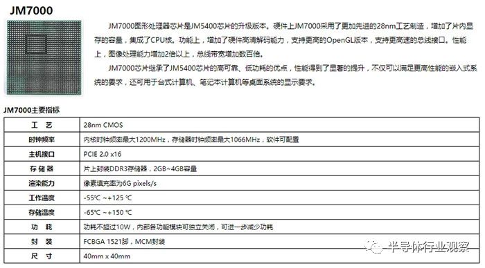 JM5400已经在国内的军用飞机等特种行业应用,之后景嘉微公司在2016年推出了新一代的JM7000系列GPU芯片,制程工艺从65nm升级到了28nm,增加了片内显存的容量,集成了CPU核。功能上,增加了硬件高清解码能力,支持更高的OpenGL版本,支持更高速的总线接口。性能上,图像处理能力增加2倍以上,总线带宽增加数百倍。