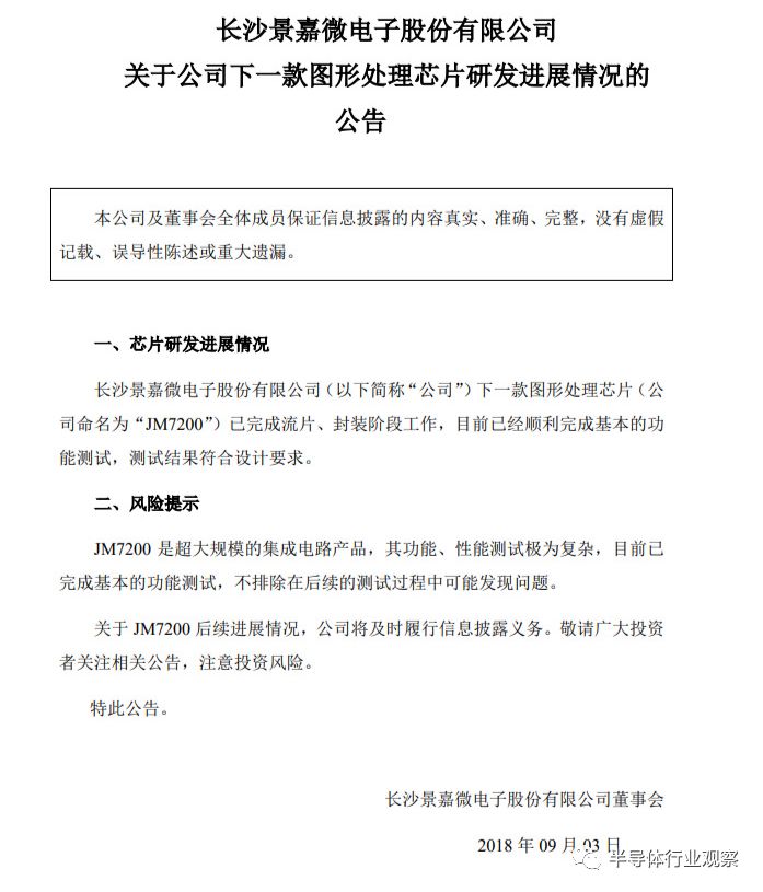 在JM7000之后,景嘉微公司还在研发新一代高性能GPU芯片,该公司昨天发布公告称下一款GPU芯片JM7200已经完成流片、封装工作,目前已经顺利完成基本的功能测试,测试结果符合设计要求。