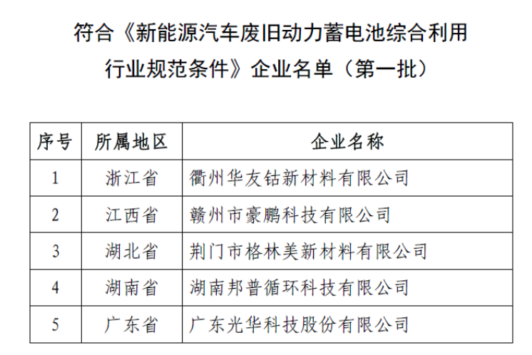 9月5日,由工业和信息化部公布了符合《新能源汽车废旧动力蓄电池综合利用行业规范条件》企业名单(第一批),其中包括浙江省衢州华友钴新材料有限公司、江西省赣州市豪鹏科技有限公司、荆门格林美新材料有限公司、湖南邦普循环科技有限公司、广东光华科技股份有限公司共有5家企业上榜。