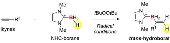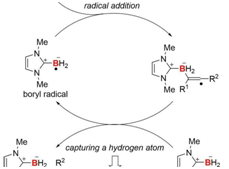 有机硼和自由基化学的结合在氢化硼酸中产生了不寻常的反式选择性。N-杂环卡宾硼烷是次化学反应的关键。这项研究将为研发新的含硼材料开辟新的道路。