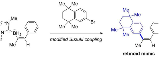 本方案用容易获得的炔烃合成了各种烷基硼烷类化合物,而这些化合物通常无法通过目前已知的方法合成。其中一些可以通过改进的Suzuki偶联转化为类视黄醇模拟物,所以它们可以作为备选药物(图3)。