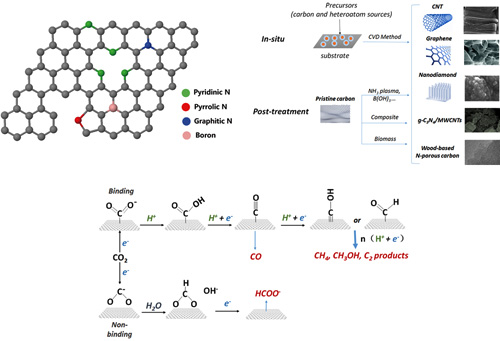 图2 用于二氧化碳电化学还原的杂原子掺杂碳基催化剂的模型示意、制备方法、与机理图解