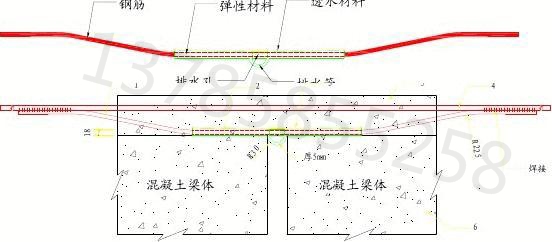 植入式桥面连续层伸出钢筋和上层钢筋网采用单面焊接,焊缝长度不应小于钢筋直径的10倍。水泥混凝土铺装层上方应铺设不小于80mm的混凝土铺装。在浇筑桥面铺装混凝土之前,应先将桥面连续缝处45cm范围内梁板顶面找平,再涂刷一层我们衡水益丰科技公司提供的专用胶水,将ECS装置妥密平铺。植入式桥面连续装置应伸出桥面护栏外,并超过下部结构外缘至少100mm。浇筑桥面铺装混凝土的顺序应从梁板跨中向两端浇筑,桥面连续处位置后浇筑。