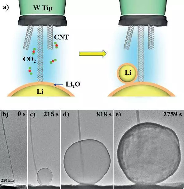 b-e) CO2环境中ASLS的生成过程。在施加负电位时,在CNT、Li2O和CO2三相交界点出现锂球。具有核-壳结构的球体随着时间的延长,其尺寸逐渐增大。