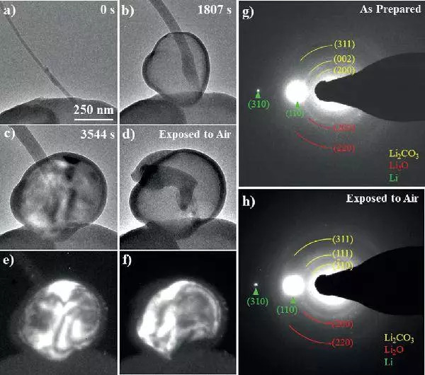 为了测试ASLS是否可以用作锂离子电池的负极,作者以ASLS作为负极,以Li2CO3、Li2O壳层作为电解质,以Au涂覆的CuO纳米线作为正极,在ETEM中构建纳米电池进行测试。