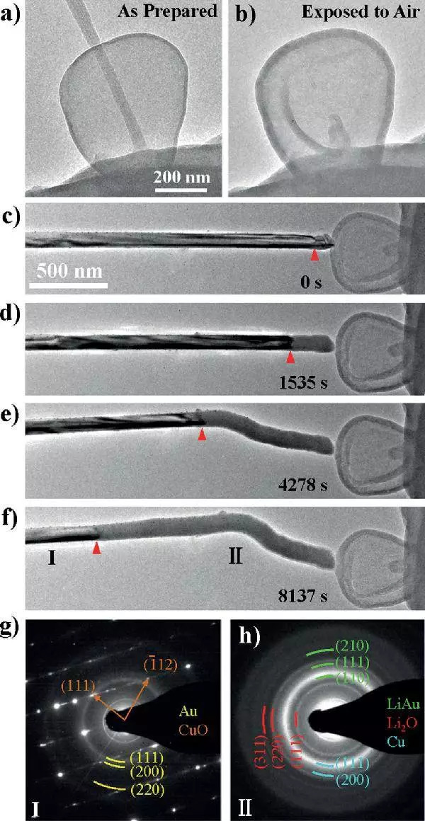 c-f) 在对Au涂覆的CuO纳米线施加负电位时,纳米线迅速锂化并体积膨胀;