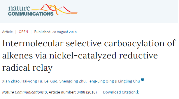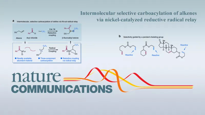 近日,东华大学先进低维材料中心特聘研究员储玲玲教授课题组在过渡金属催化烯烃官能团化研究领域取得新进展,相关研究成果以《镍催化未活化烯烃的分子间还原碳羰基化反应》(Intermolecular selective carboacylation of alkenes via nickel-catalyzed reductive radical relay)为题,在国际知名学术期刊《自然》(Nature)子刊《自然•通讯》(Nature Communications)上在线发表。