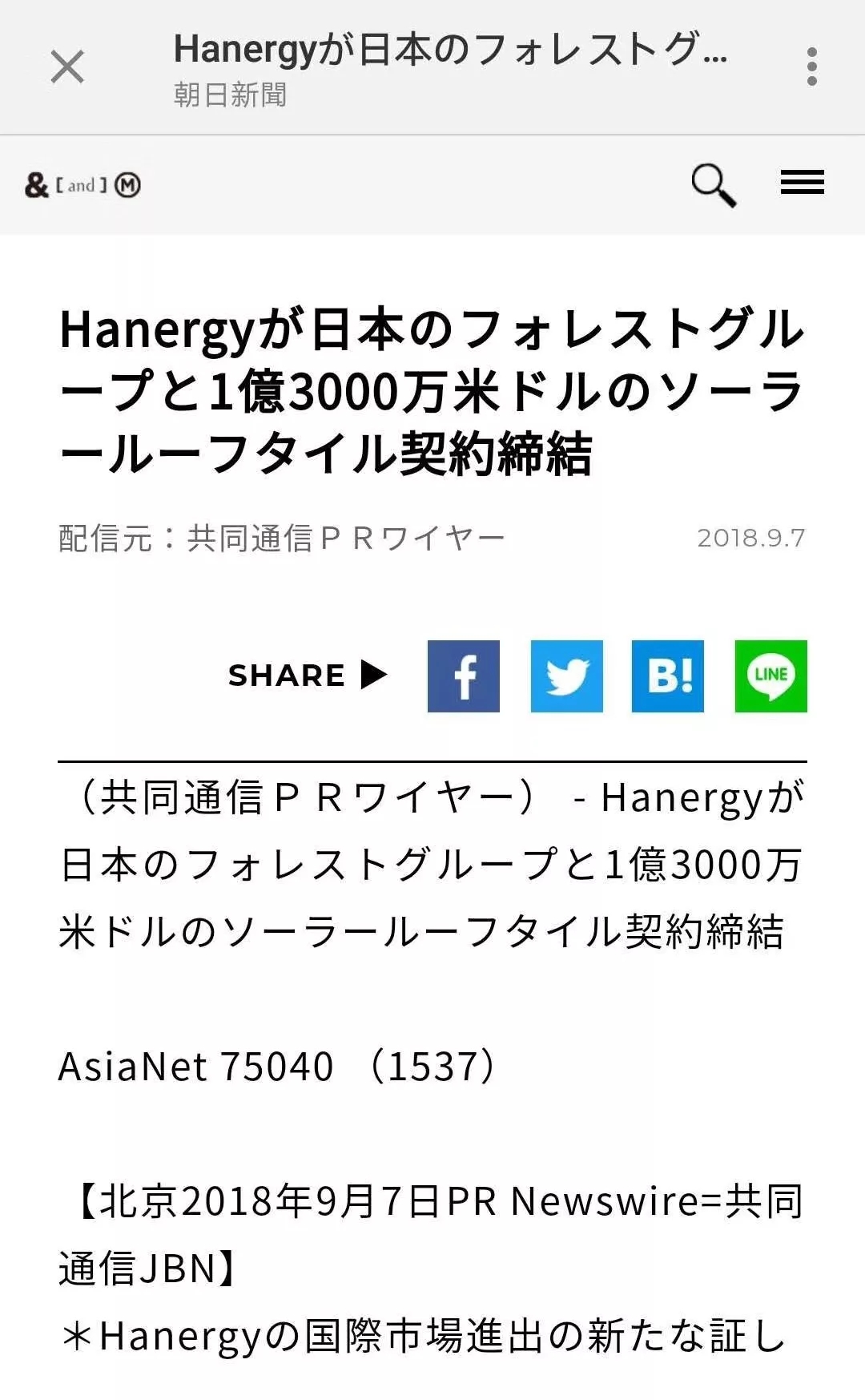 森春幸表示:“本次和汉能签约汉瓦预售协议,是应未来5至10年,日本住宅用户零排放政策下,光伏的商业前景而决定。我们非常看好汉能的薄膜发电产品。”